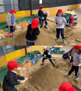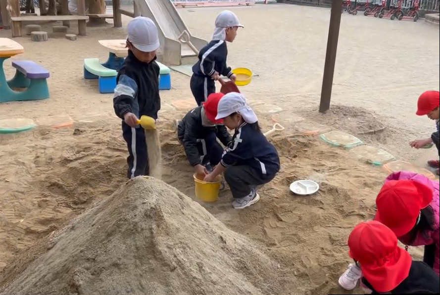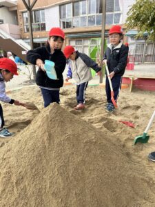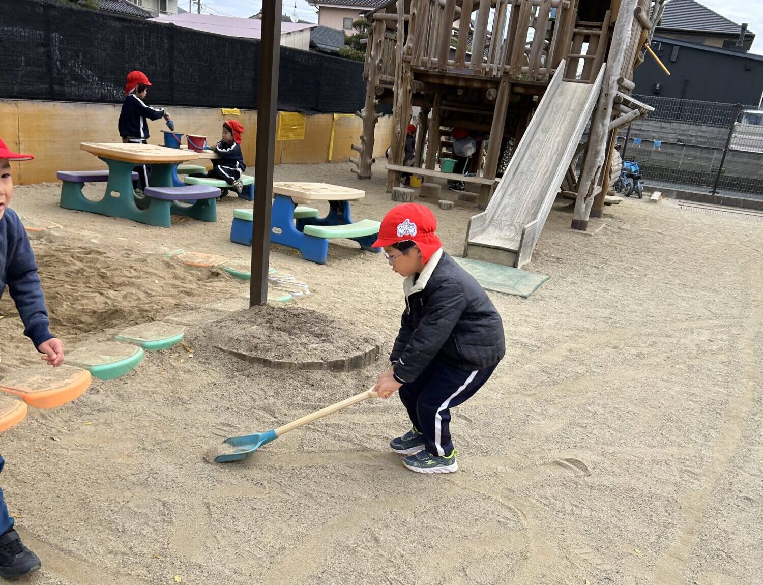 あれっ 男の子が砂場の外の白砂をすくっていますよ。