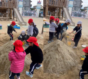 みんなで次々と白砂を集めてきては、砂山にかけていきます。