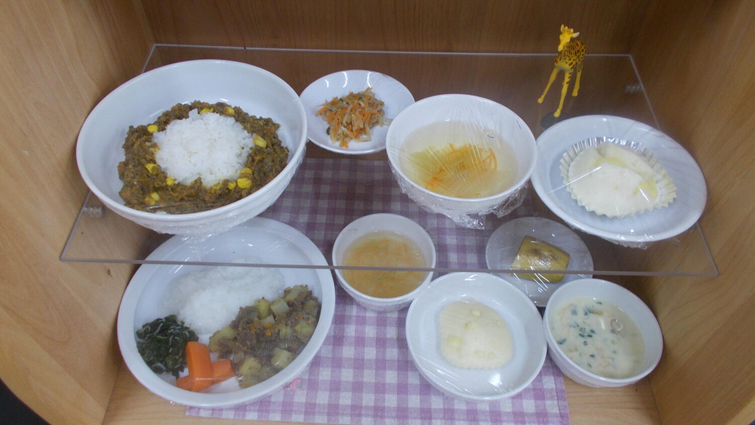 ドライカレーには合挽肉、玉ねぎ、人参、コーン、レーズン、ミックスビーンズ、にんにく、カレールウを使用しています。レーズンとコーンの甘みがしっかりして美味しかったです。