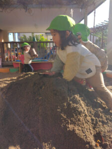 砂山遊びから発展して、木製のすべり台によじ登って遊ぶ子も見られました。