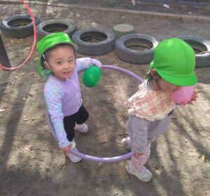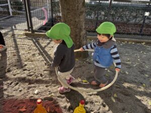 大人気のフープの電車ごっこで、友だちと楽しく遊んでいます!