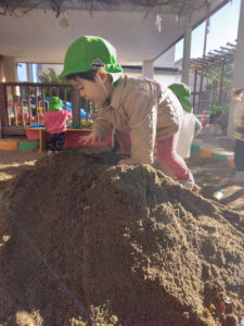 砂場にできた山を見つけると、興味津々で近づいていく子どもたち。