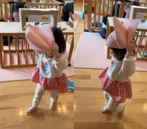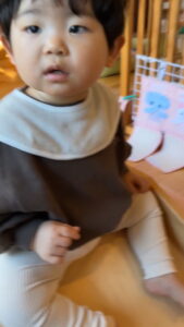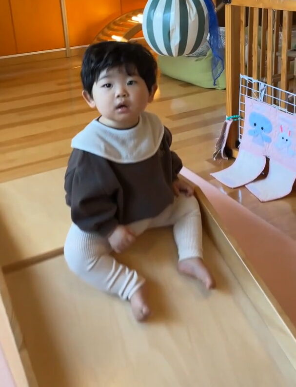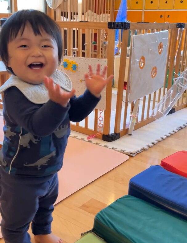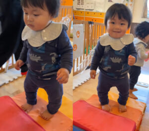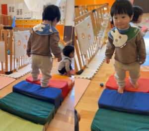 ウレタンマットのお山を登り切ると、振り返り 保育者と目が合うと…ニコッ🥰