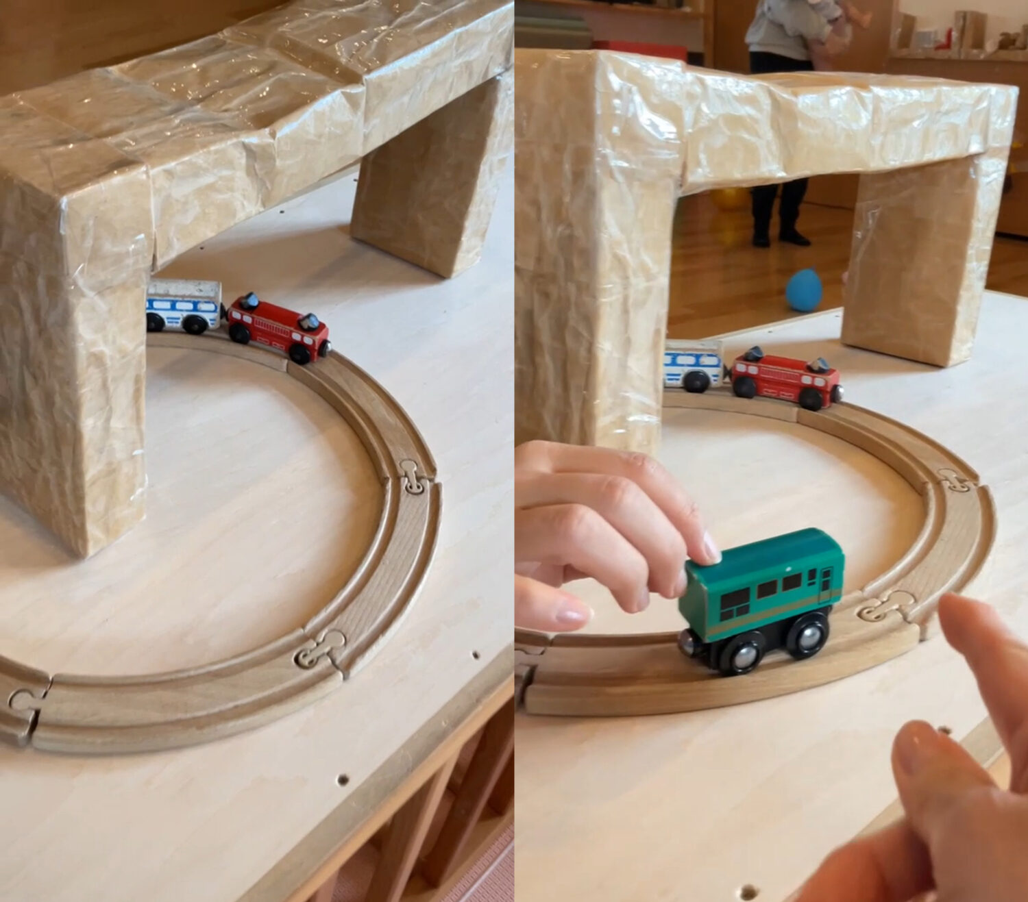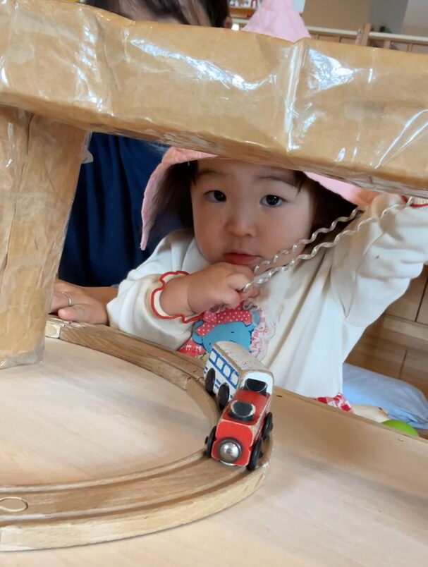 先生がレールの途中にトンネルを置き、列車をくぐらせようと動かしてみると、子ども達は大喜びです!☝🏻👩🏻
