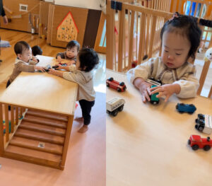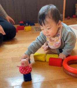 この子はカラーブロックを列車に見立てて、ぬいぐるみを乗せて遊んでいます。