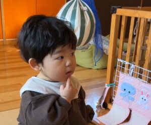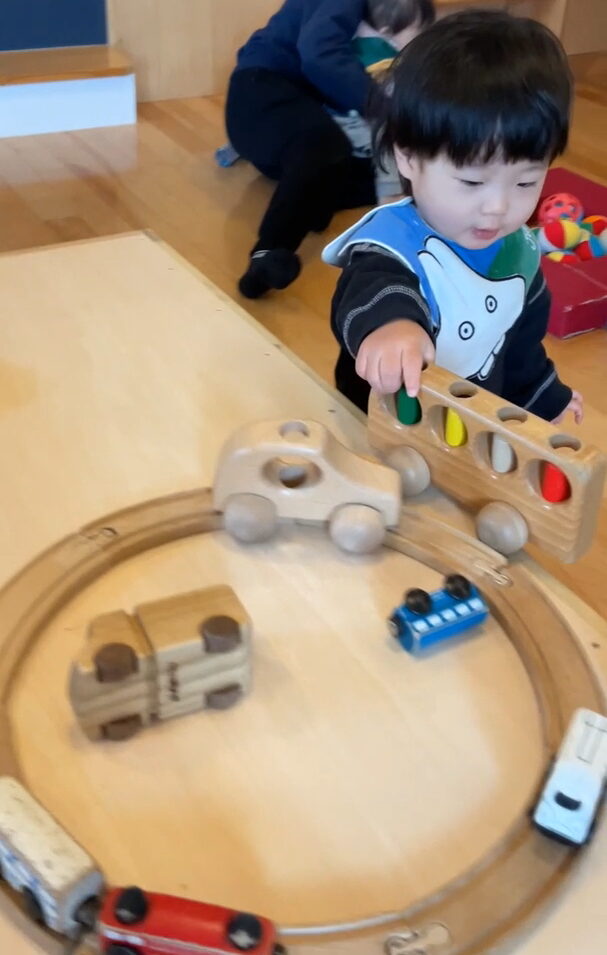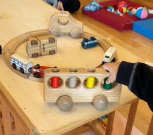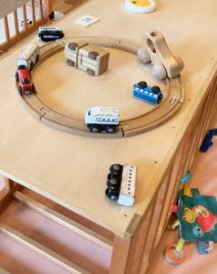 👩🏻「これについて少し説明すると、お部屋にオモチャの列車を置いたところ、子ども達が興味を示しました。」