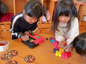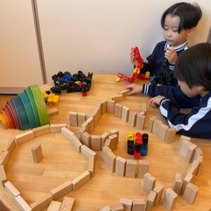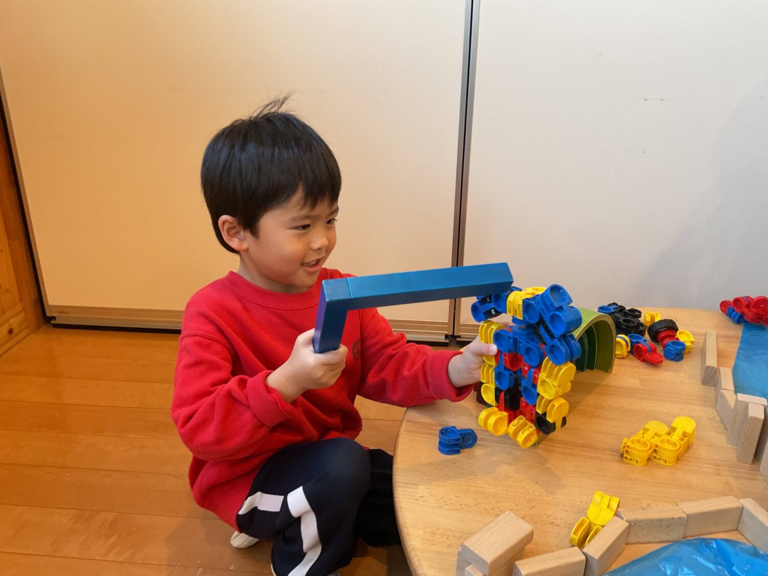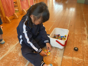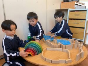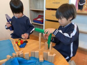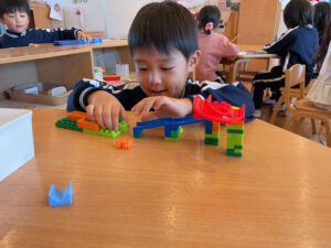 「あのね、シャワーって自分で立っているでしょ?だからそうしたいんだぁ。」と積み木を使って工夫する姿が見られました。