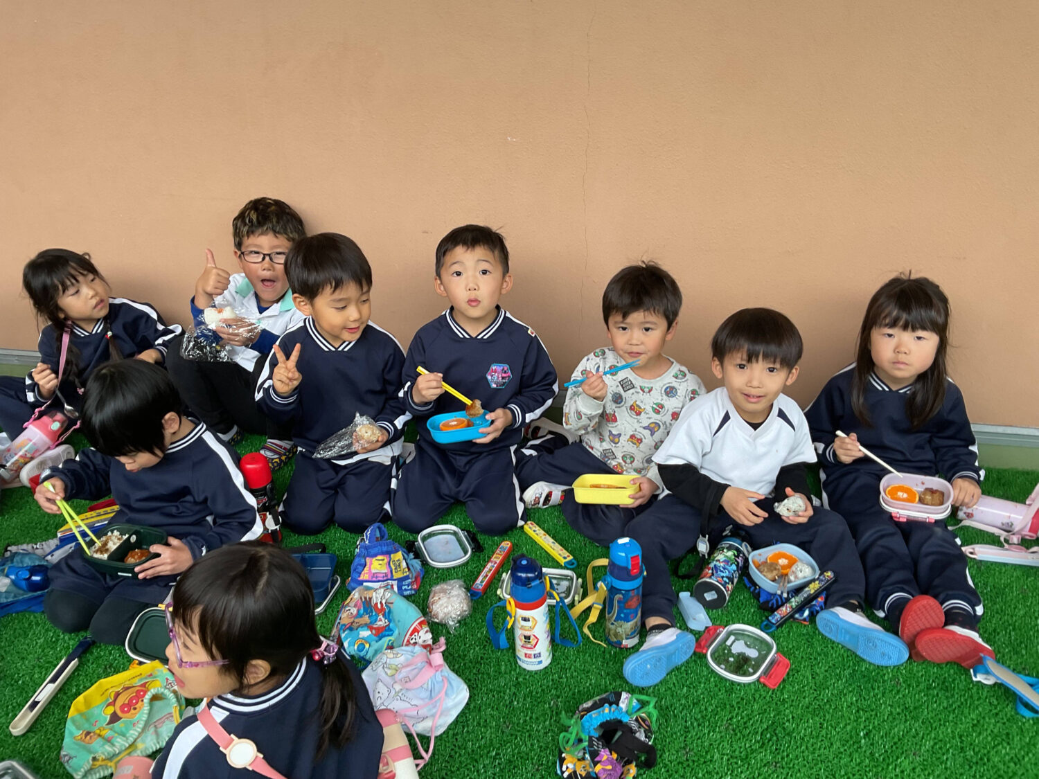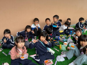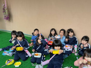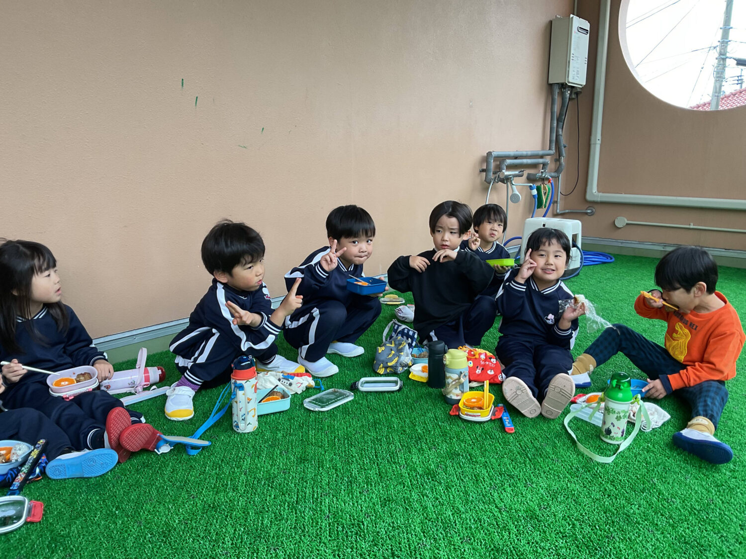 あいにくのお天気でしたが、お外に行くことを楽しみにしていた子ども達の希望に答え、テラスに出て食べました!