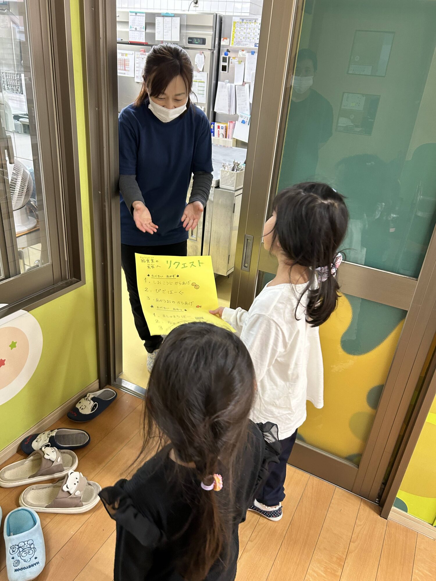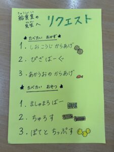 卒園も兼ねて、給食の先生たちに給食メニューをリクエストをおねがいしようと提案しました。