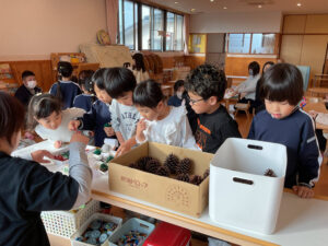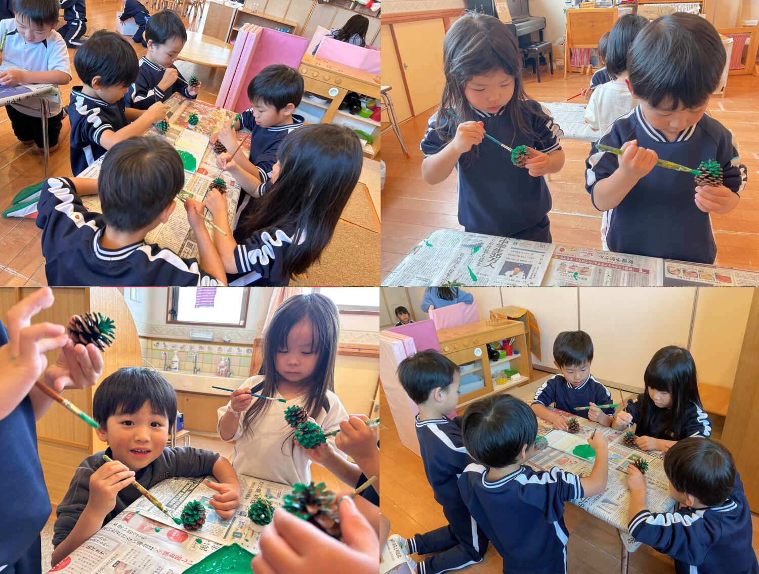 子ども達は小さな松ぼっくりに絵の具で色塗り🎨