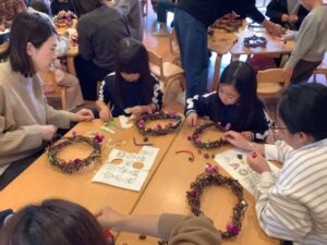 リースを作り上げる中で、「こうしたらどう?」「コレをつけると可愛いよ💖」などと親子の会話がはずみます。