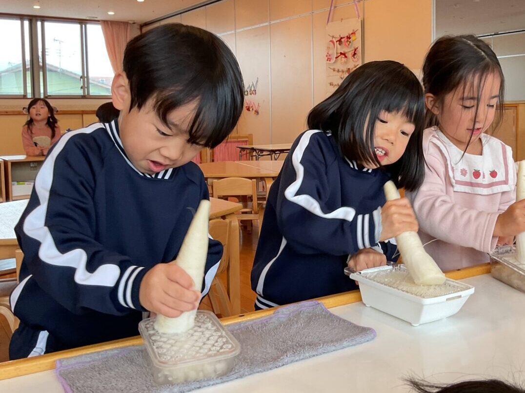 「お餅つきごっこ」が盛り上がっていたので、畑で収穫した大根も そうした遊びにつなげ、調理活動のメニューを考えてみました💞