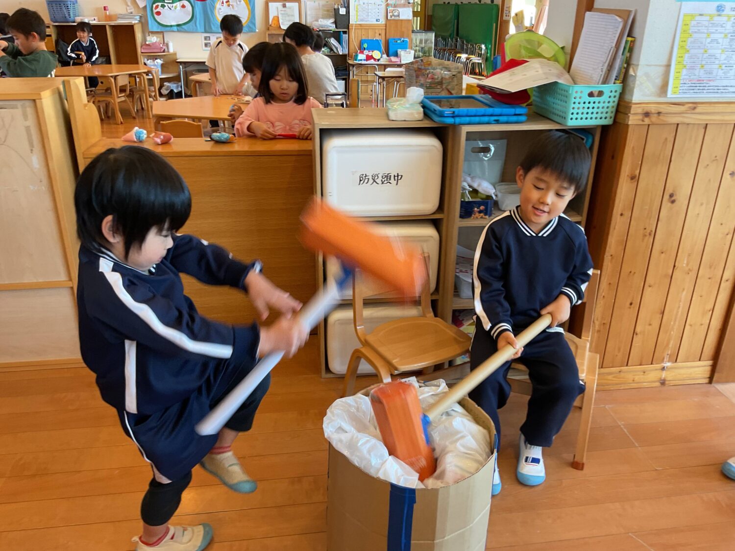 👦🏻👧🏻「何だかこれ、お餅つきの道具みたいだね!」という声が上がり、そこから遊びが広がって「お餅つきごっこ」に発展しました☺️