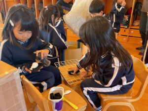焼いて食べる準備をしていた腹ぺこチームが、お箸を使いながらお餅を焼いていきます👧🏻