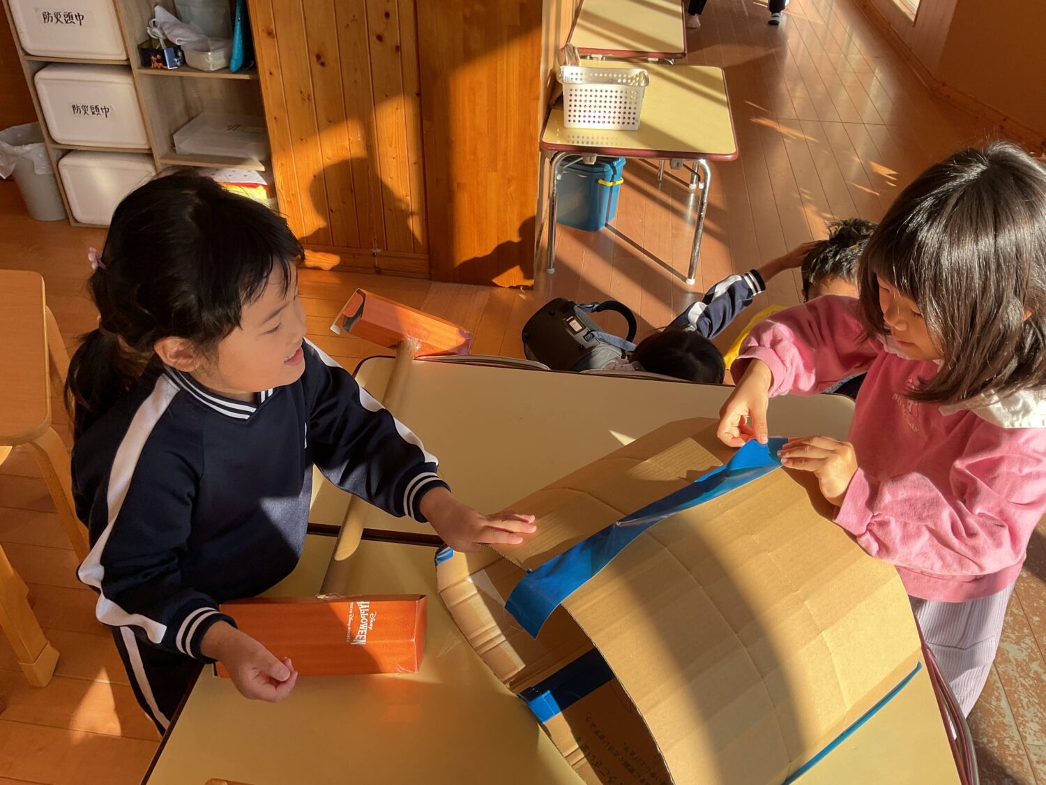 切り開いたダンボールを丸めてテープで留めると、立派な臼の出来上がり✨