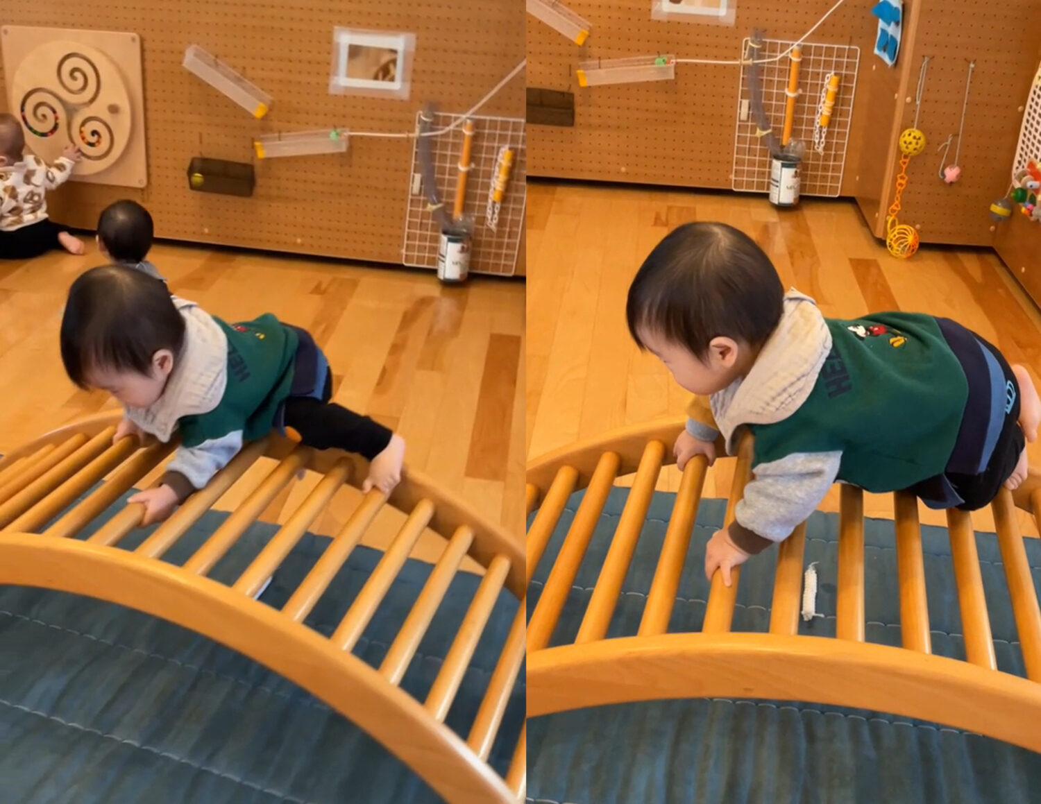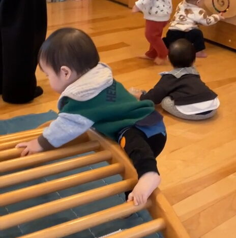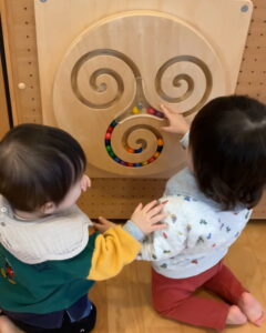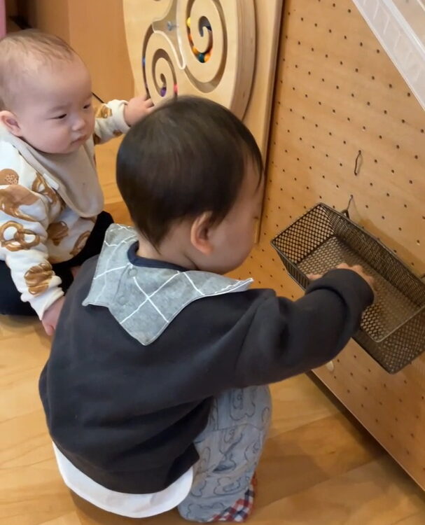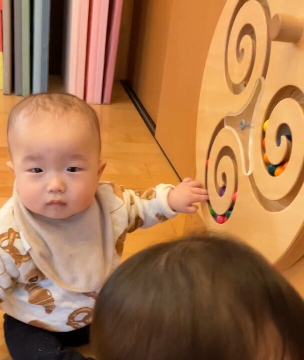 他の子が遊んでいる壁面遊具にも興味を示し…