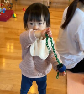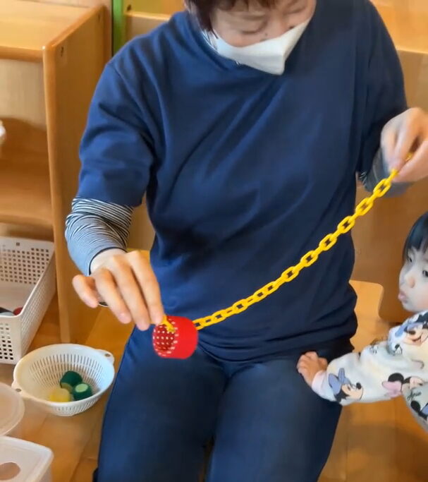 さてこちらでは、一人の子がカラーチェーンを使って「リング渡し」に挑戦中です。