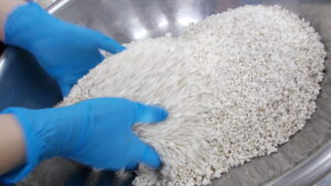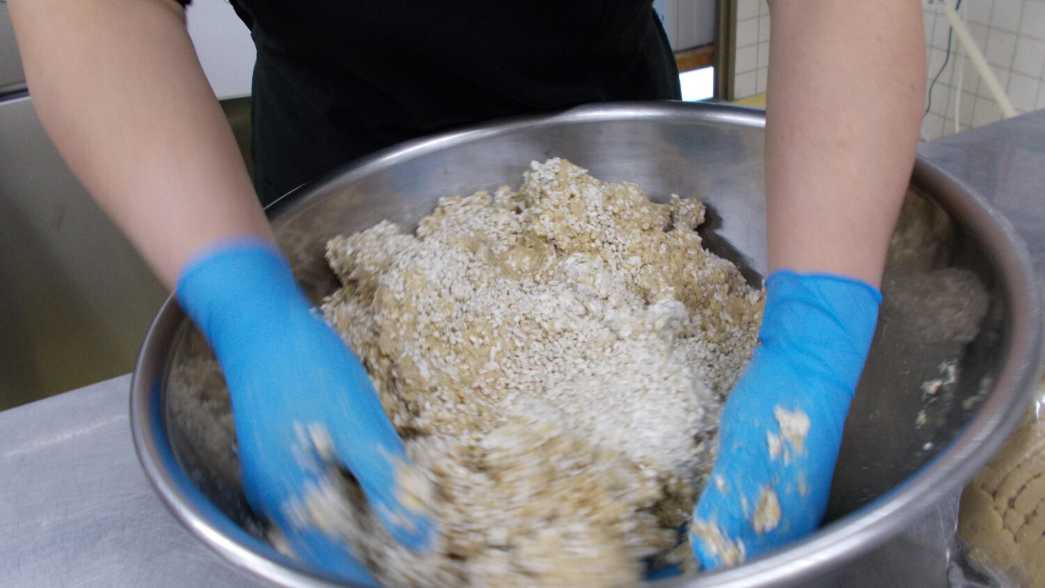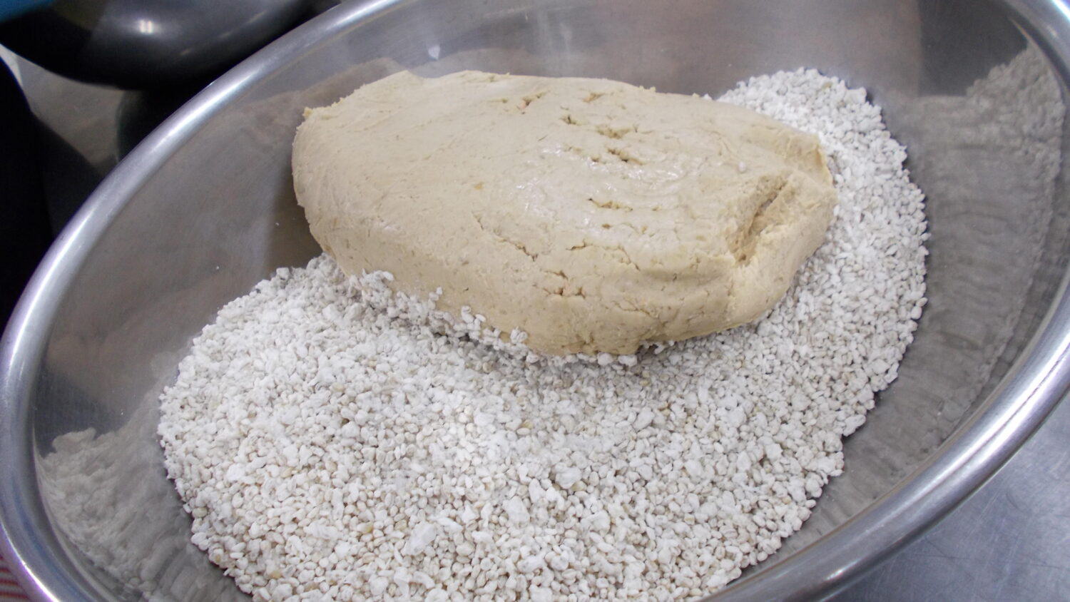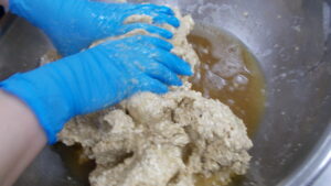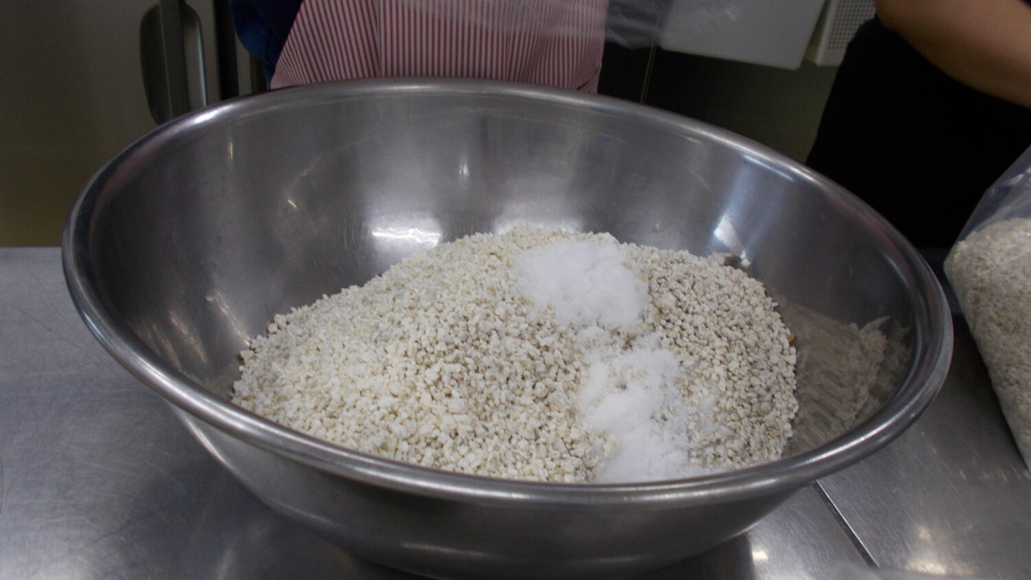 まずボウルの中に麦生麹と米生麹、塩を入れてまぜます。ポップコーンのような匂いがしました🍿