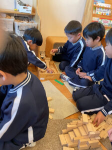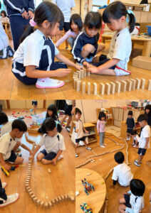 前回は積木を使っての「ドミノ倒し」に挑戦しましたが、今回は積木を使ってのコースづくりです。