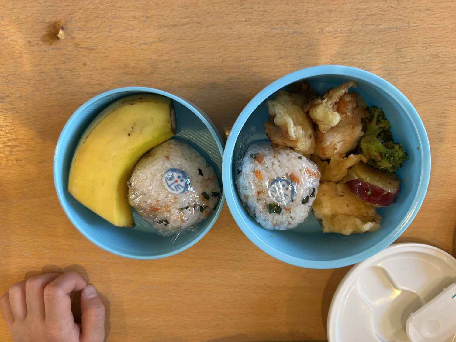 今回のメニューは、とり天、ブロッコリーおかか和え、さつまいも甘煮、バナナでした😊