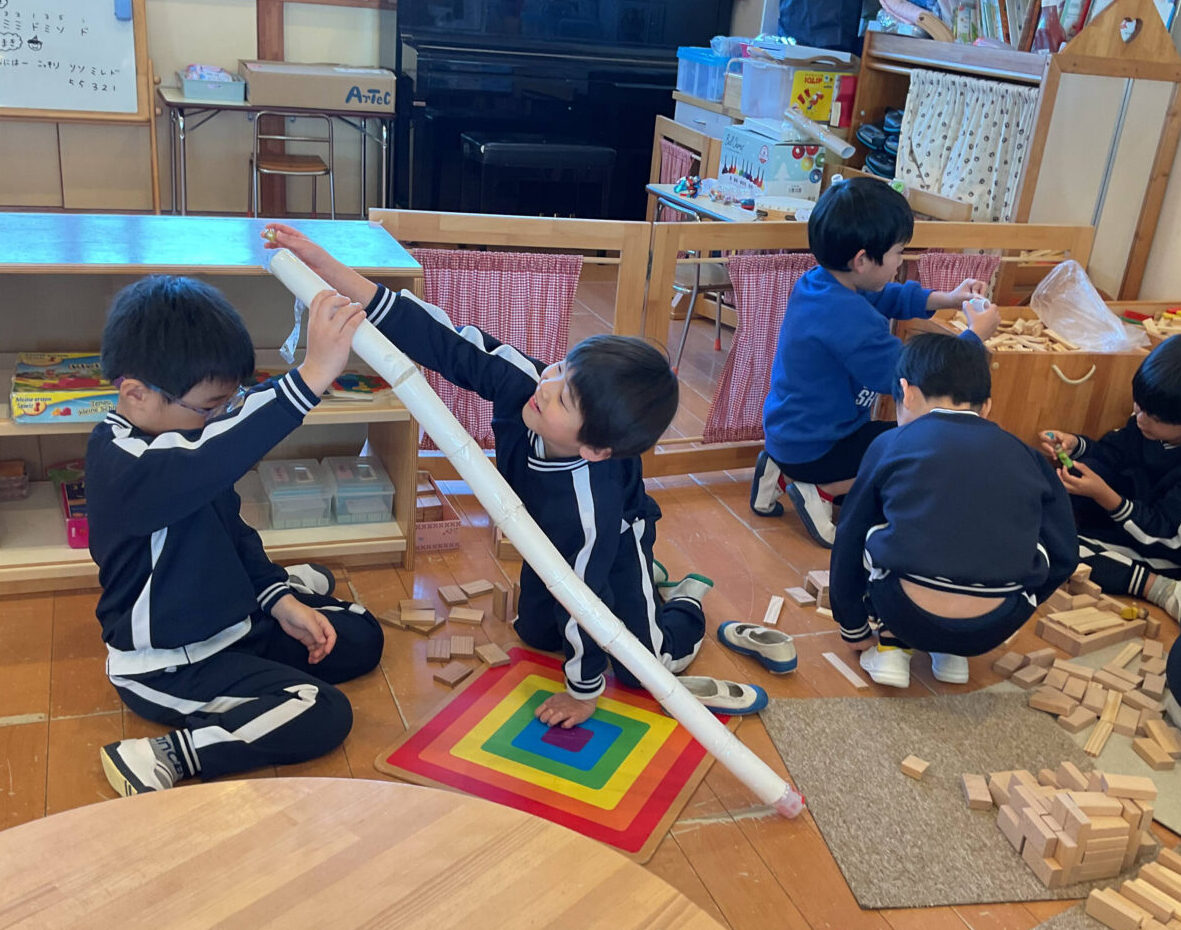 その横では、積木ではなくトイレットペーパーの芯をつなげたトンネルを制作。