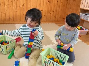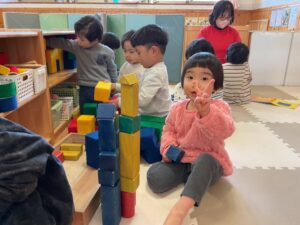 ブロック遊びでは、色や形を選びながら高く積み上げたり、横につなげたりと、試行錯誤を繰り返す姿が見られます。