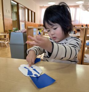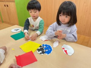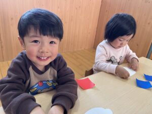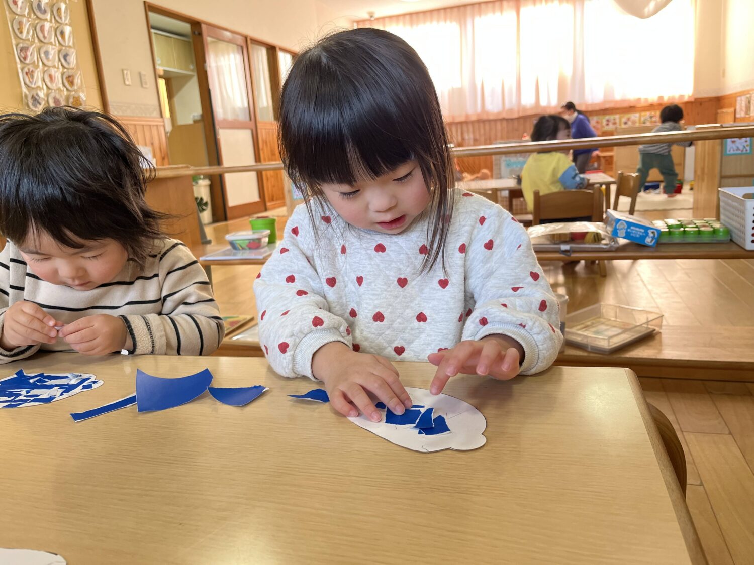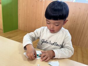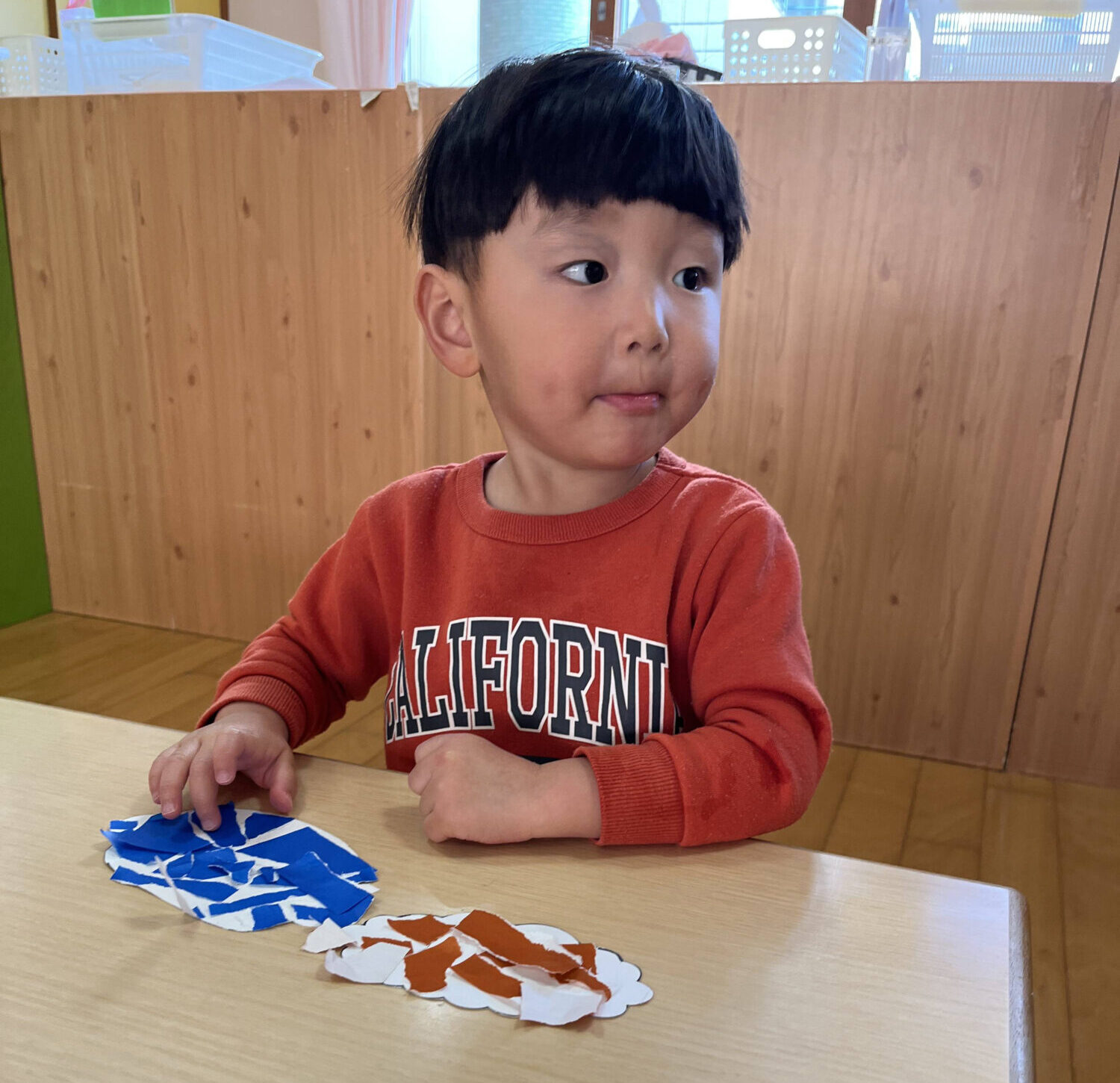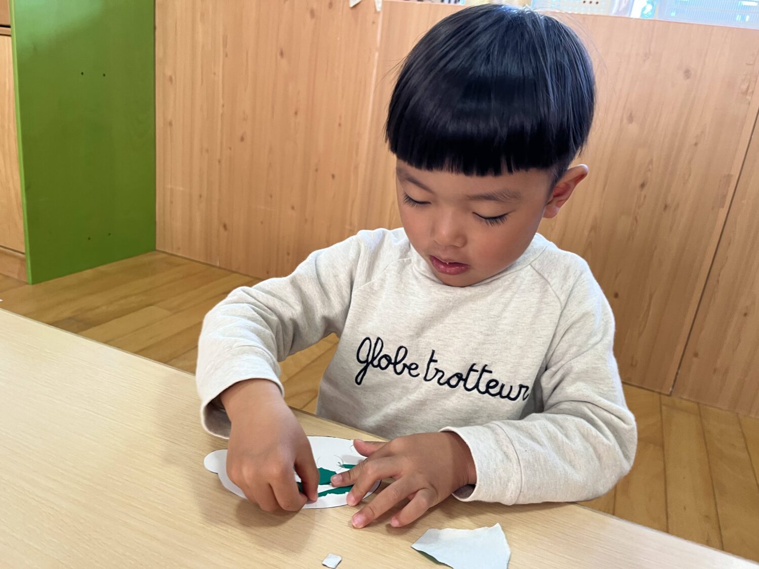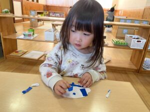 小さな指で折り紙を押さえ、のりをつけて貼る動作もとても上手になってきました。
