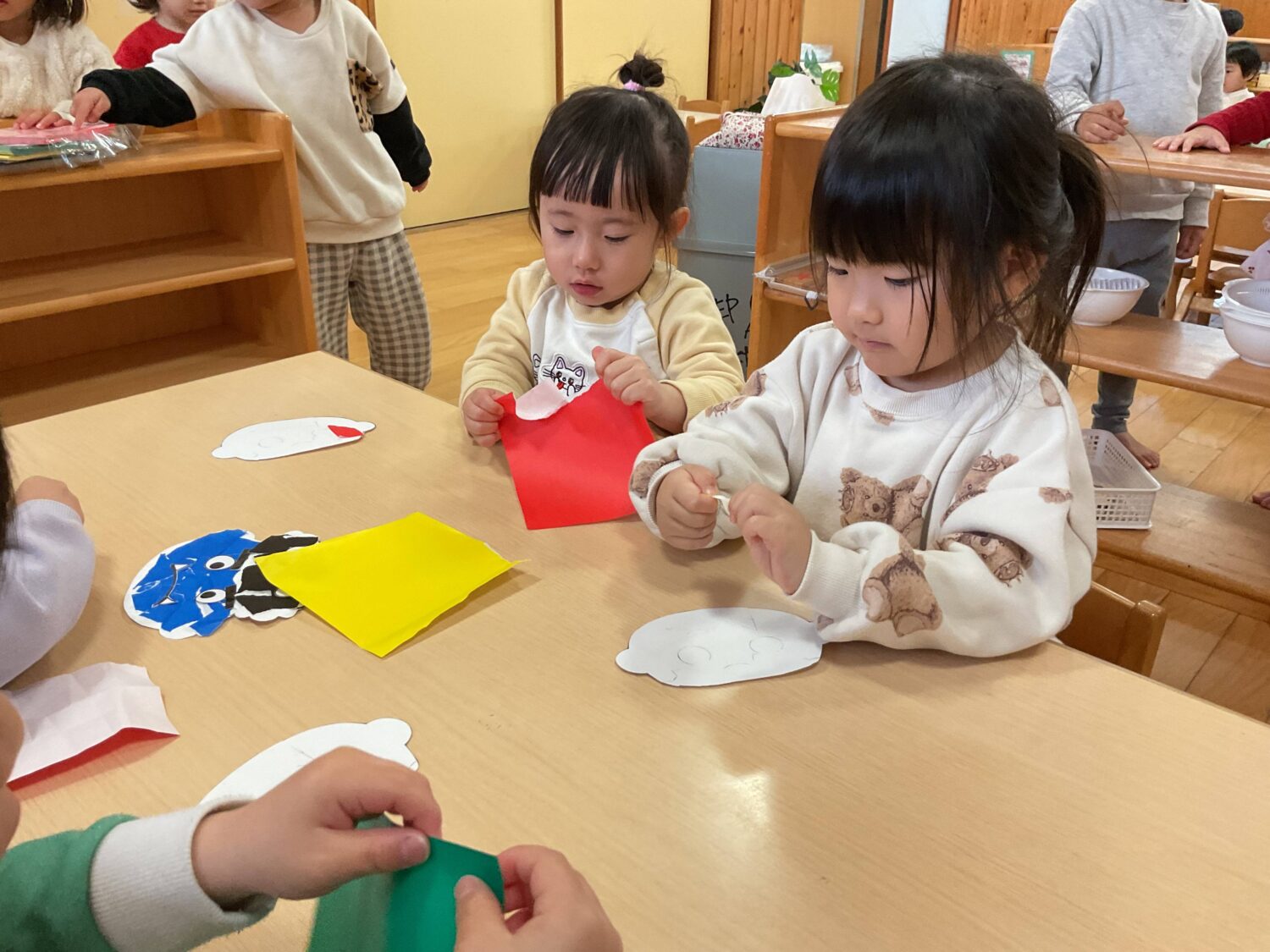 ちぎった折り紙を、鬼の顔の台紙に一つひとつ貼っていきます。