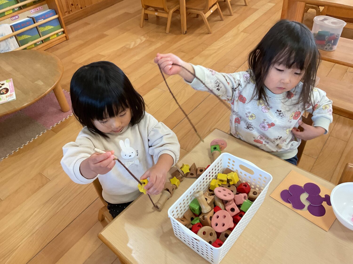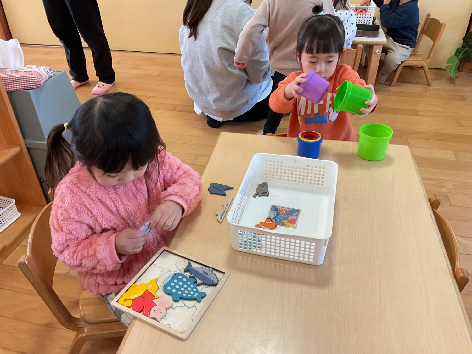 指先を使い、よく見て考えながら一つひとつ進める姿には、2歳児ならではの成長の表れが感じられます。