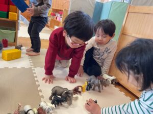 動物を並べたり動かしたりしながら、お友だちとやり取りしながら遊んでいます。