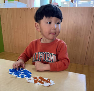 「ここかな?」と考えながら、保育者とやりとりをしつつ取り組む姿が見られました。
