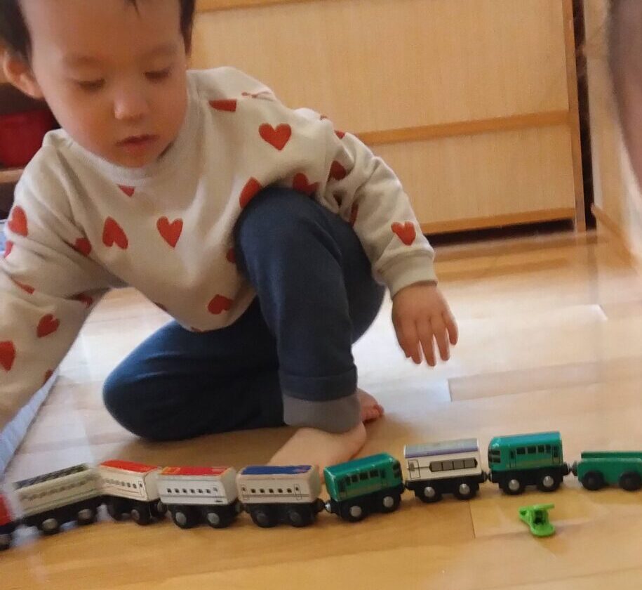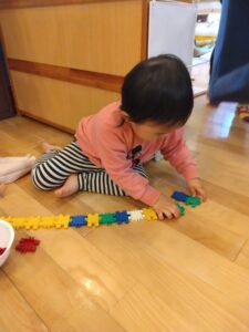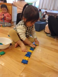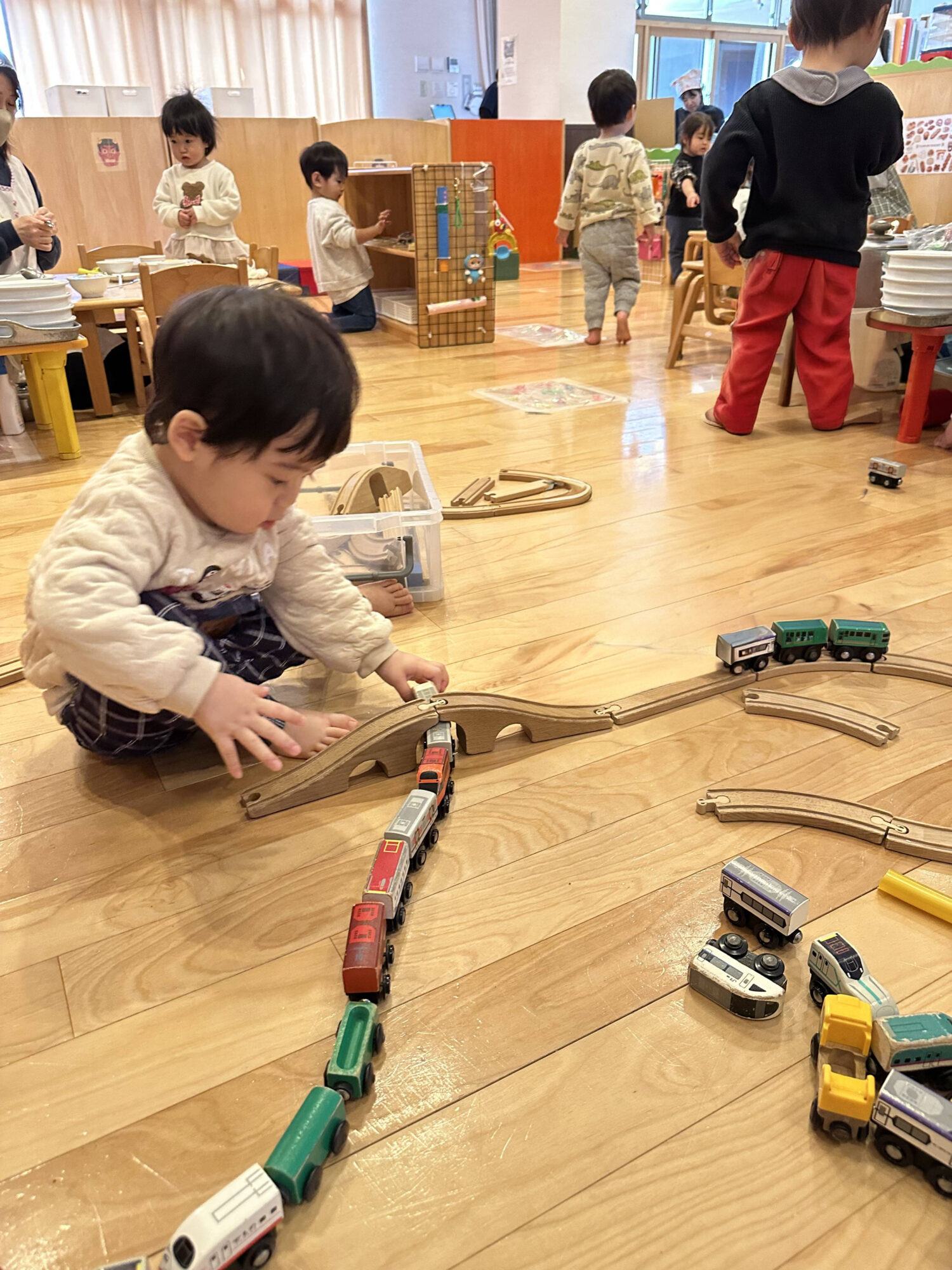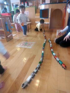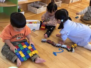 ブロックや電車を「長く、長く」つなげる遊びに夢中になっている姿が多く見られます。