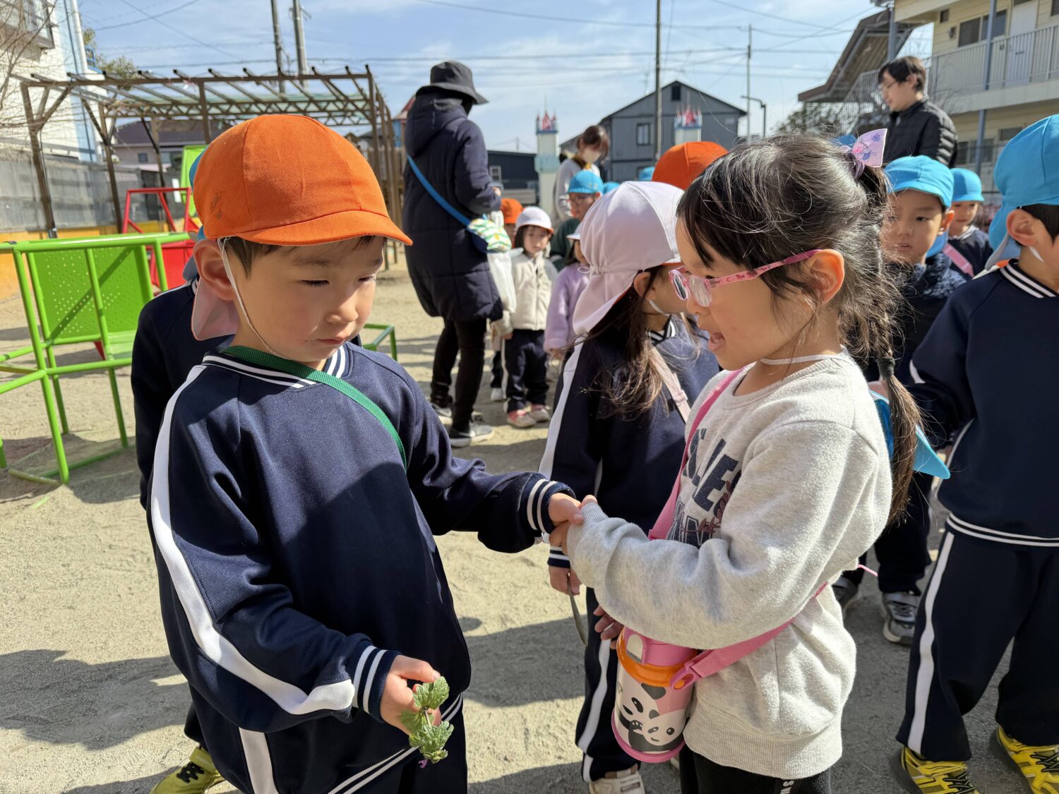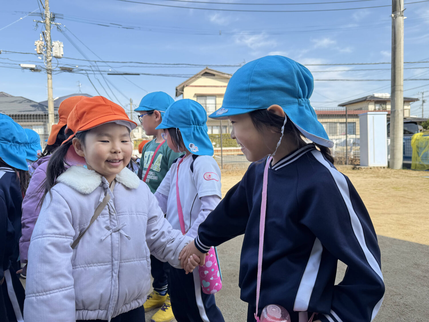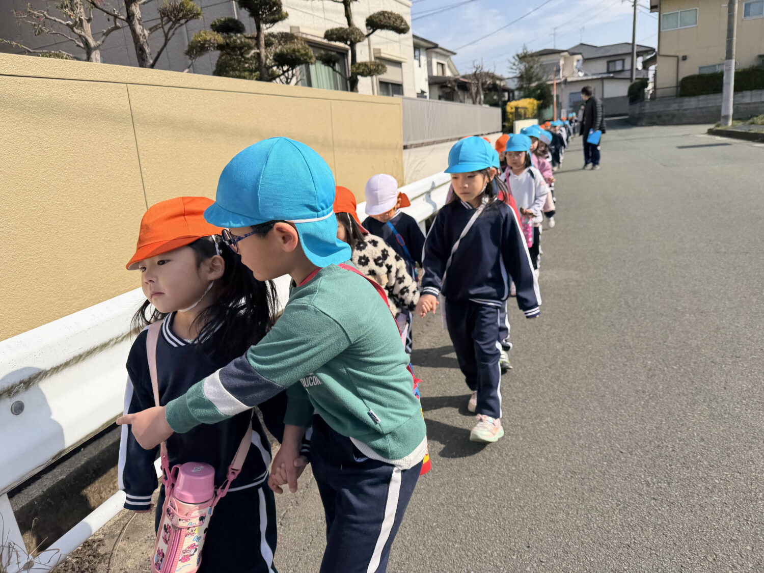 しっかりと手を繋ぎ、小さなひまわり組のお友だちを安全に導いていきます。