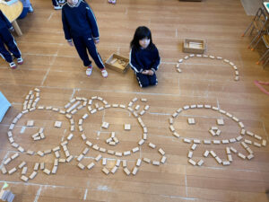 床に積木を並べて、かわいいキャラクターを作っていました。