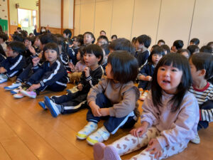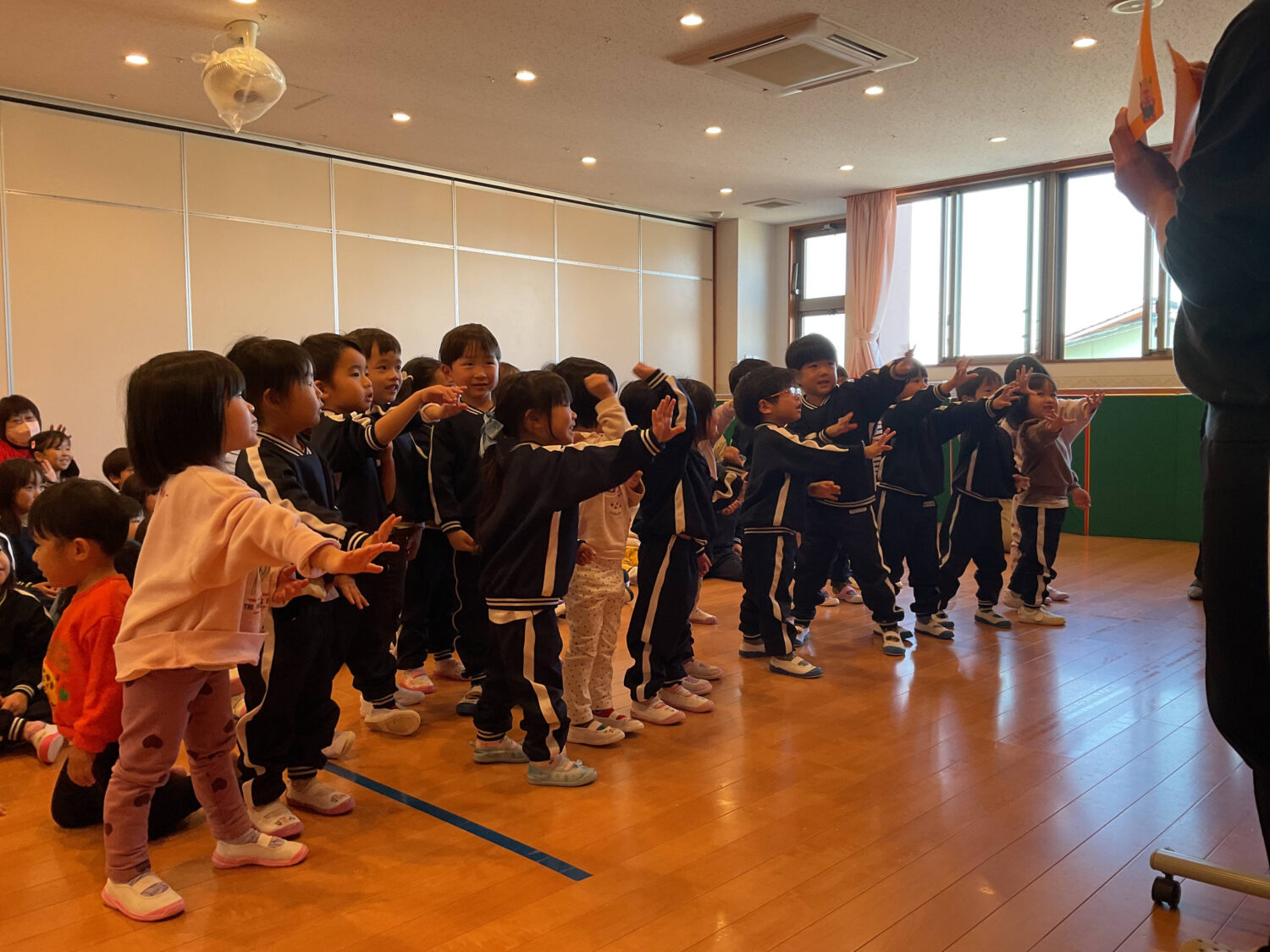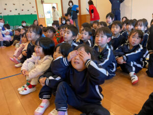 「きゃー!!」目を隠すお友だち、「あはは😆」笑顔いっぱいのお友だち、「…」言葉を失うお友だちと様々な表情の子どもたちでした。