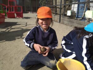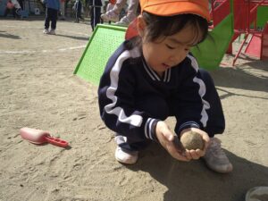 ばらぐみのお姉さんたちがどろだんごを作っているのを見て、ひまわりさんもチャレンジ!!