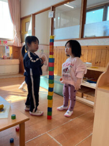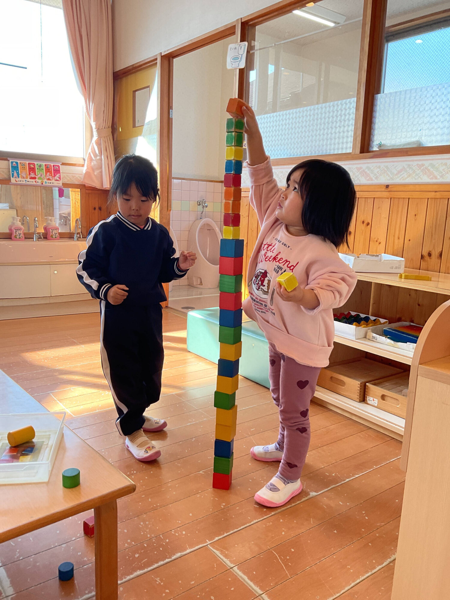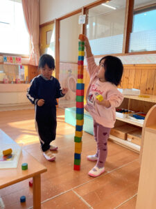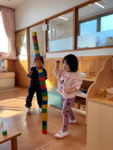 積んでは倒れを何度も繰り返していましたが、腕を伸ばしたり、つま先立ちをしたりし、バランスを取りながら自分たちの背よりも高く積んでいました✨