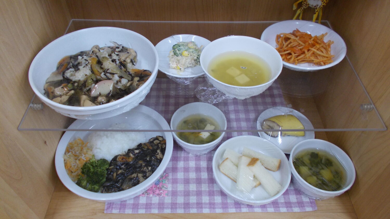 ひじき丼には鶏小間肉、ひじき、玉ねぎ、人参、かまぼこ、いんげんの食材を使用しています。餡たっぷりで味がしっかりとついていておいしかったです。
