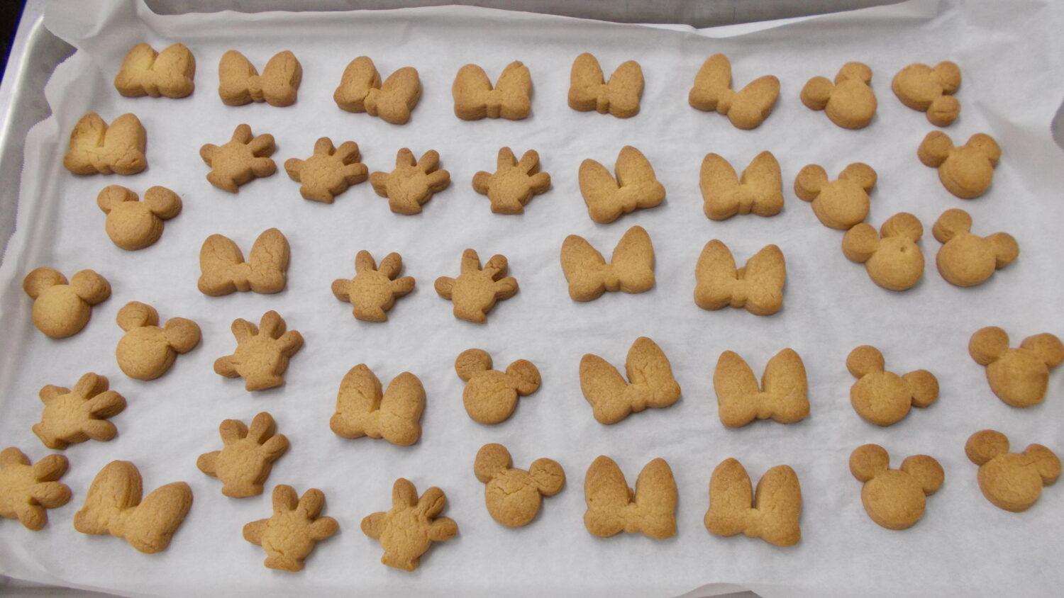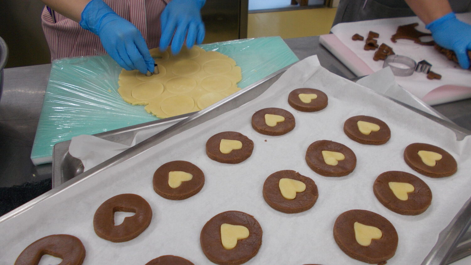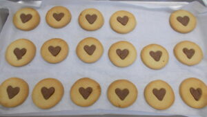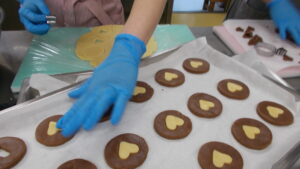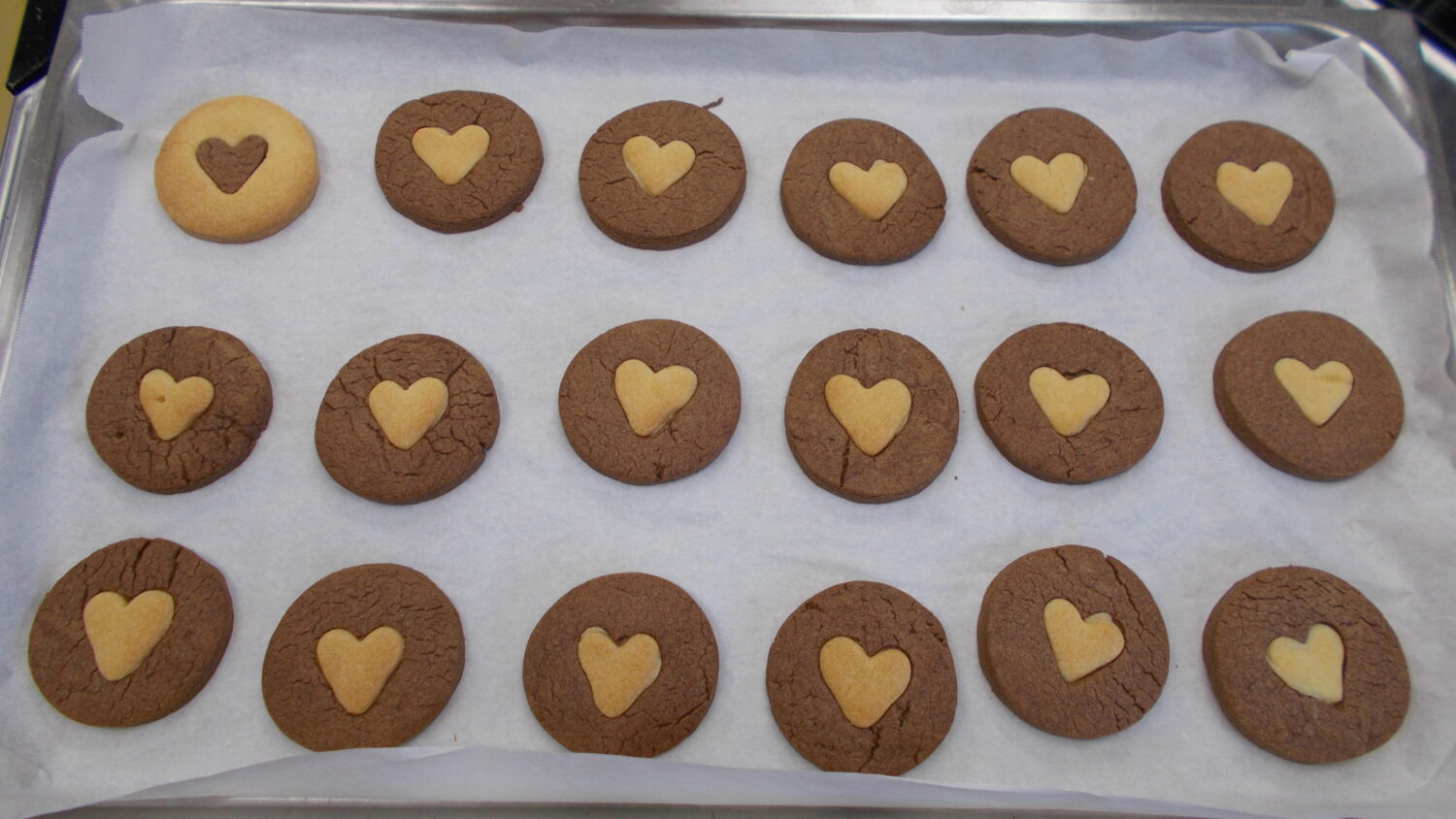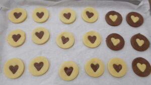 プレーン味とココア味のクッキー生地を作り、〇と♡の型抜きをしてそれぞれの味を入れ替えてつくりました!