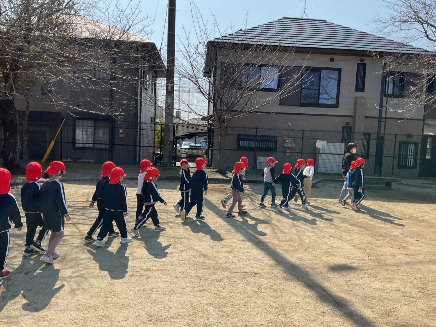 今月の火災🔥避難訓練は、なかなか火の勢いが収まらないという想定で、お隣の出仲間公園まで避難しました。