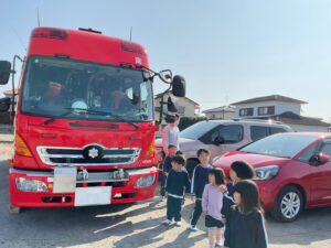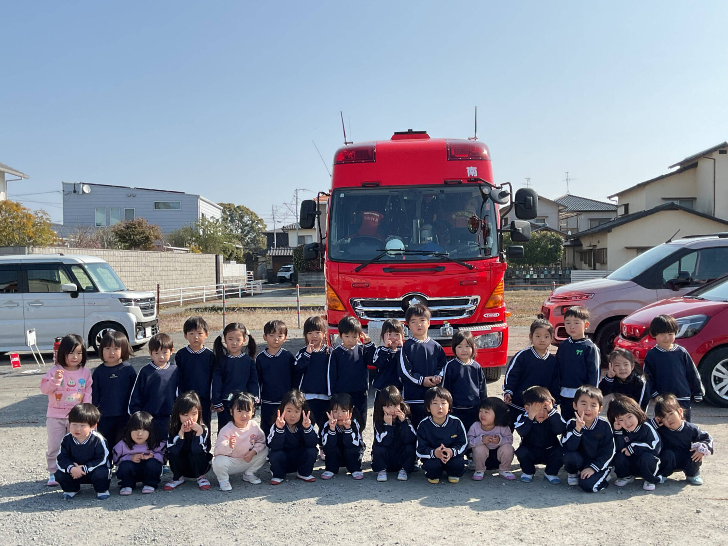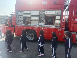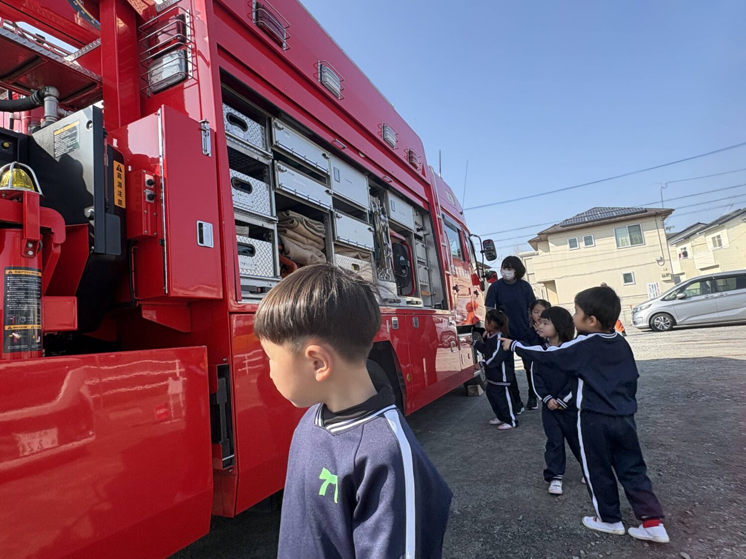 ちょっぴりドキドキしながらも、間近で見る本物の消防車に触れた体験は、子どもたちの心に強く残ったようで、園に戻ってからも「さっきの消防車ね〇〇だよ~!」などと話題が尽きませんでした。