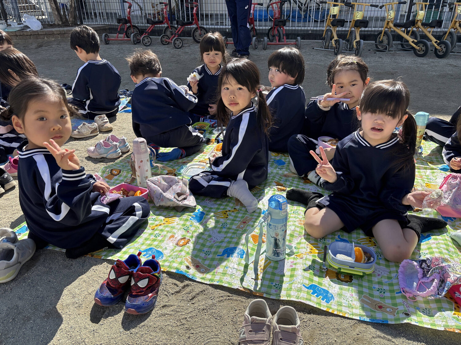 青い空を見上げながら、飛行機や雲など外の景色を楽しみ、お友だちと一緒に嬉しそうにお弁当を頬張る子どもたちの姿が見られました💖