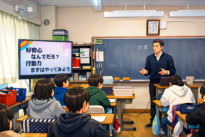 授業では、アントレプレナーシップを「新しいことに挑戦し周りを良くする力」と説明し、井上さん自身の挫折経験から「失敗しても挑戦は続けられる」と伝え、好奇心(なんでだろう?)と行動力(まずやってみる)の大切さを強調されました。