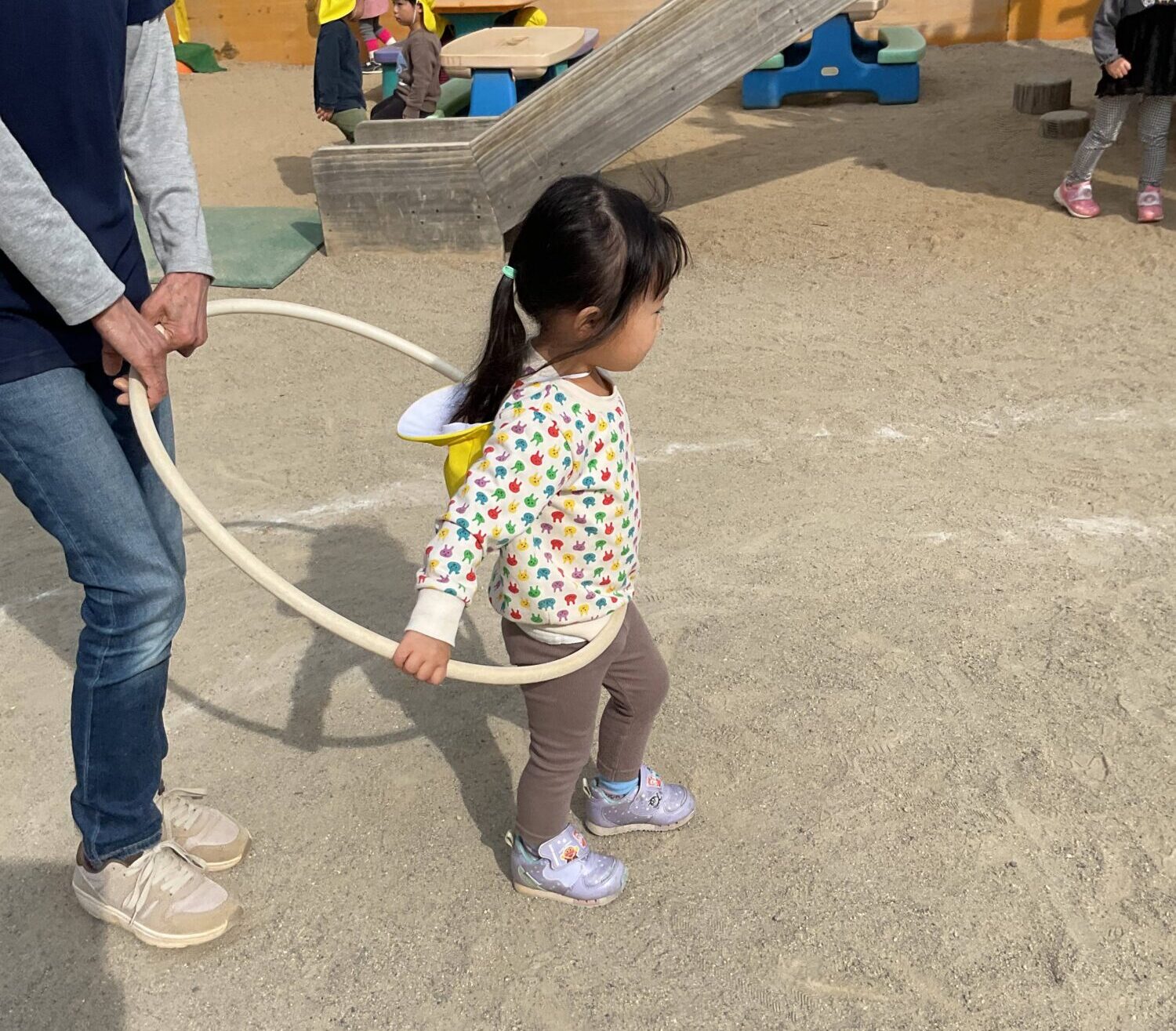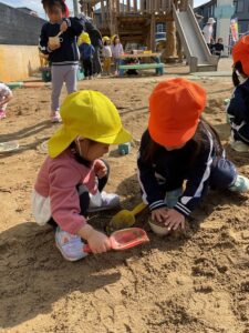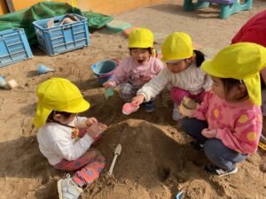ちゅうりっぷ組の子どもたちは「やった〜!」という表情で外へ飛び出し、砂の感触を確かめながら遊びにぐんと集中していました。