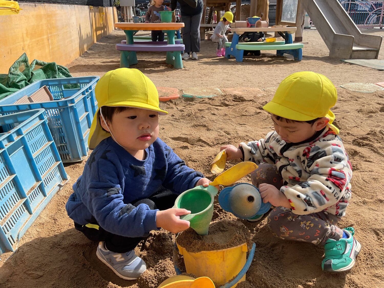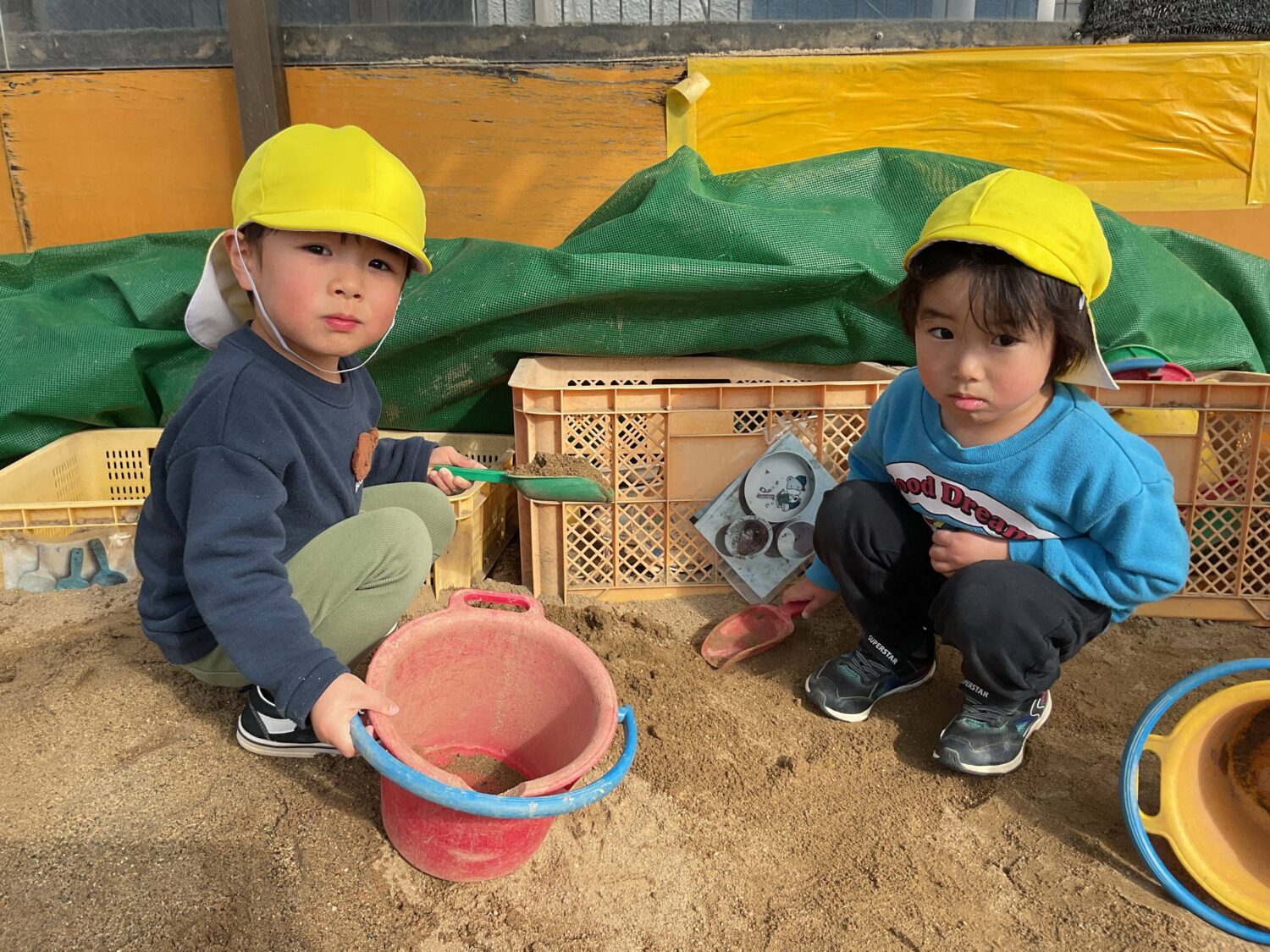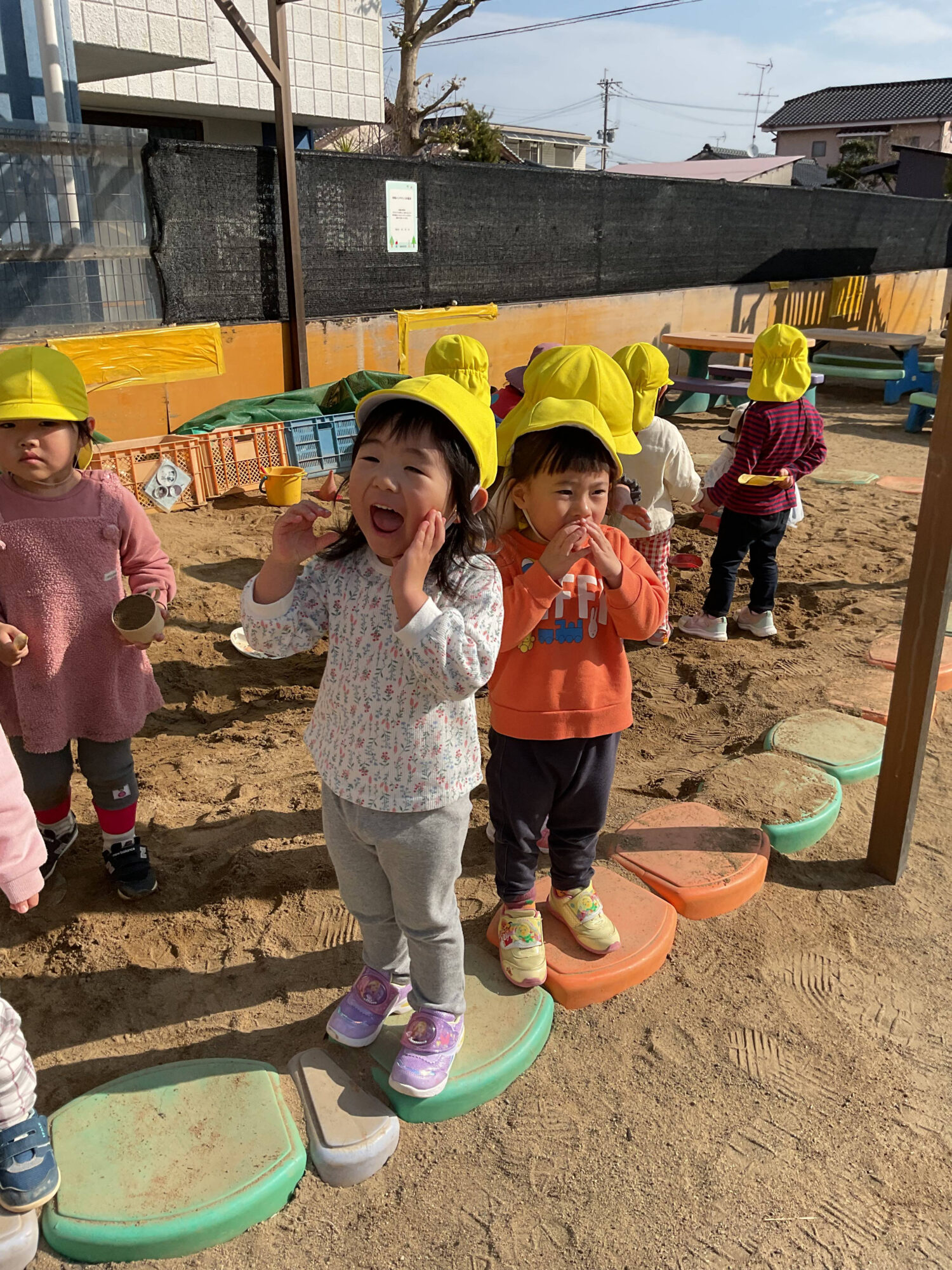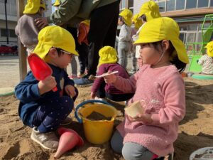 昨日の雨がうそのように空が晴れ、園庭の砂場にはあたたかな日差しがたっぷり✨