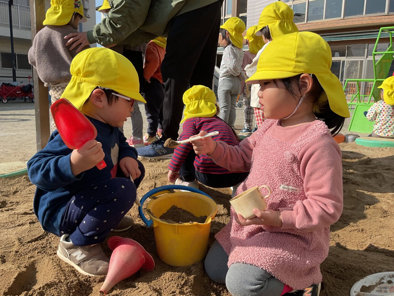 スコップで砂をすくってバケツに入れたり、カップにぎゅっと詰めて「どうぞ」とごちそうを作ったり。