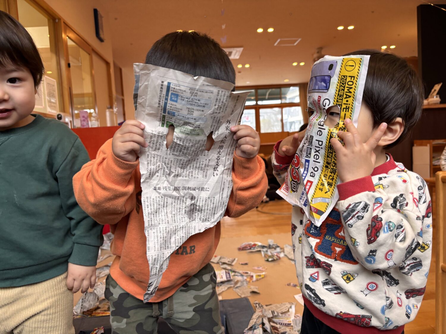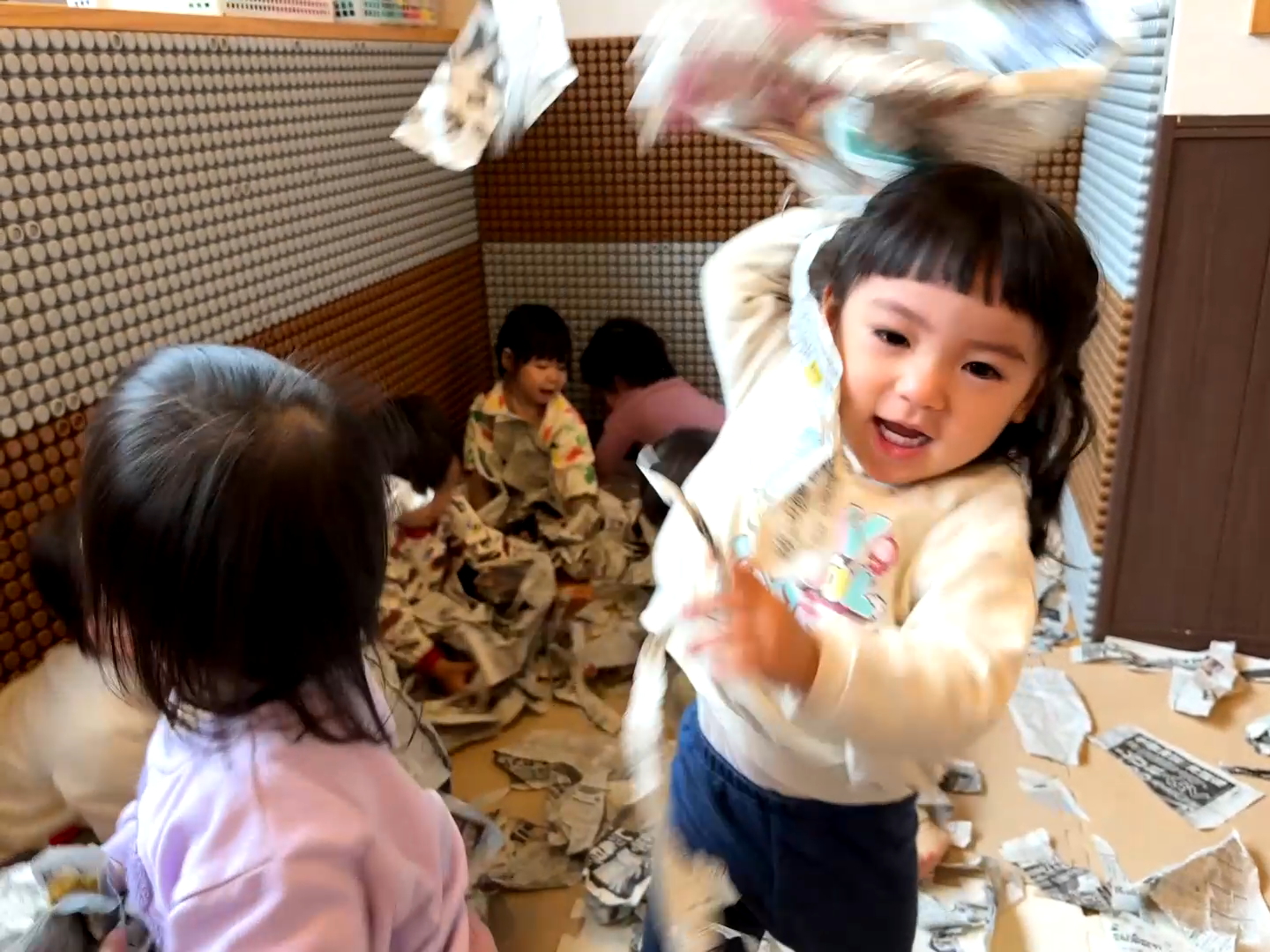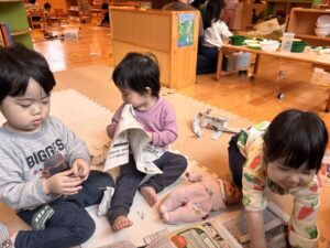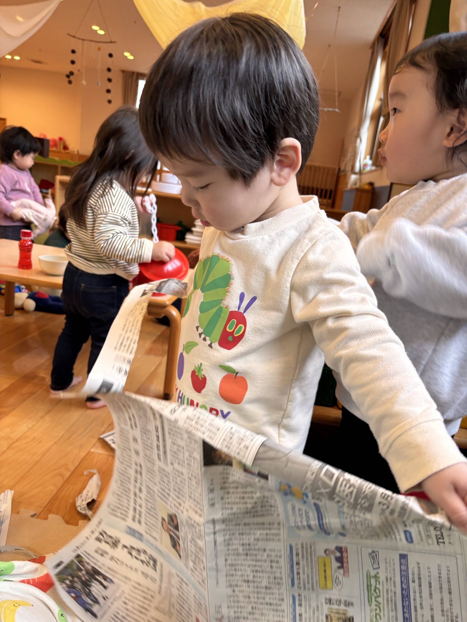 破った新聞紙をヒラヒラ舞わせてみたり、集めて山にしたりと、遊び方もどんどん広がっていきましたよ。