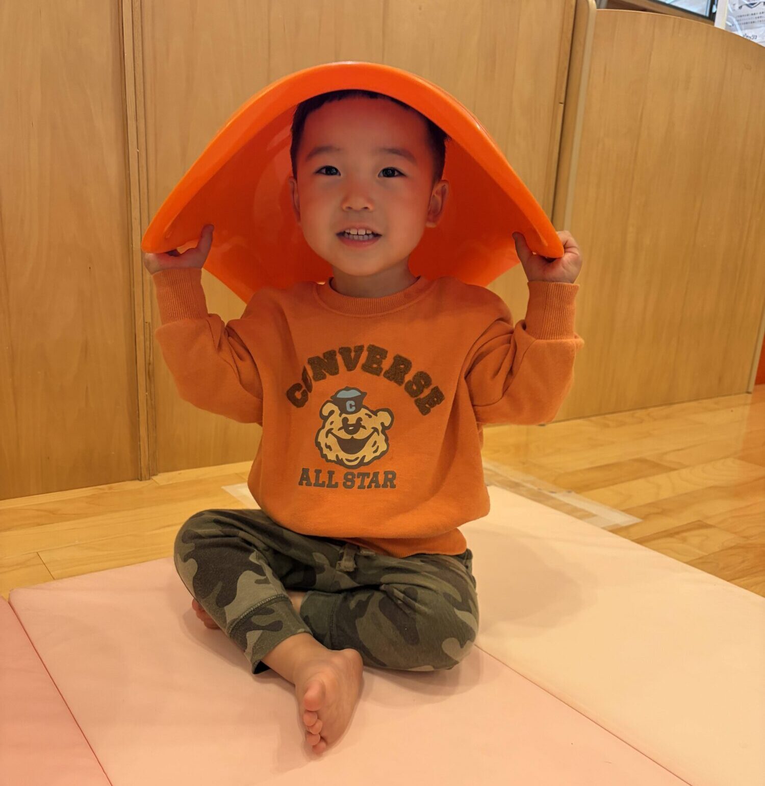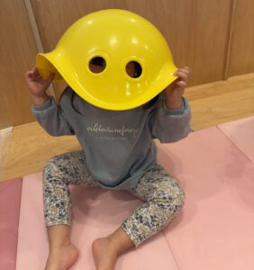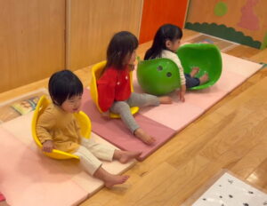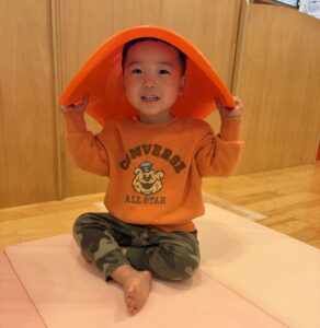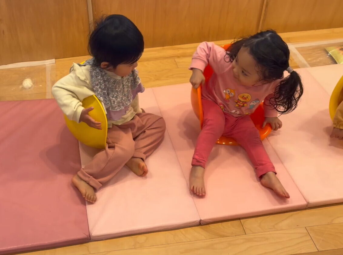 ゆらゆら揺れる不思議な形に興味津々で、子どもたちは「すわってみる」「おしりでこぐ」「かぶってみる😂」「ひっくり返してのぼってみる」など、思い思いの遊び方を見つけて楽しんでいました。