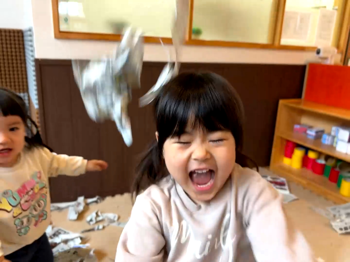 今日は天気もあまり良くなかったので、お部屋で「新聞紙やぶり」をして遊びました📰✨