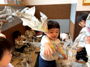新聞紙破りは、つまむ・引っぱる・丸める動きを通して指先や手の力、体の使い方が育ちます。ビリビリ破れた達成感が意欲と集中につながり、音や手触りを楽しむことで気持ちの発散にもなります。